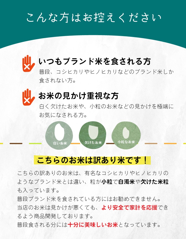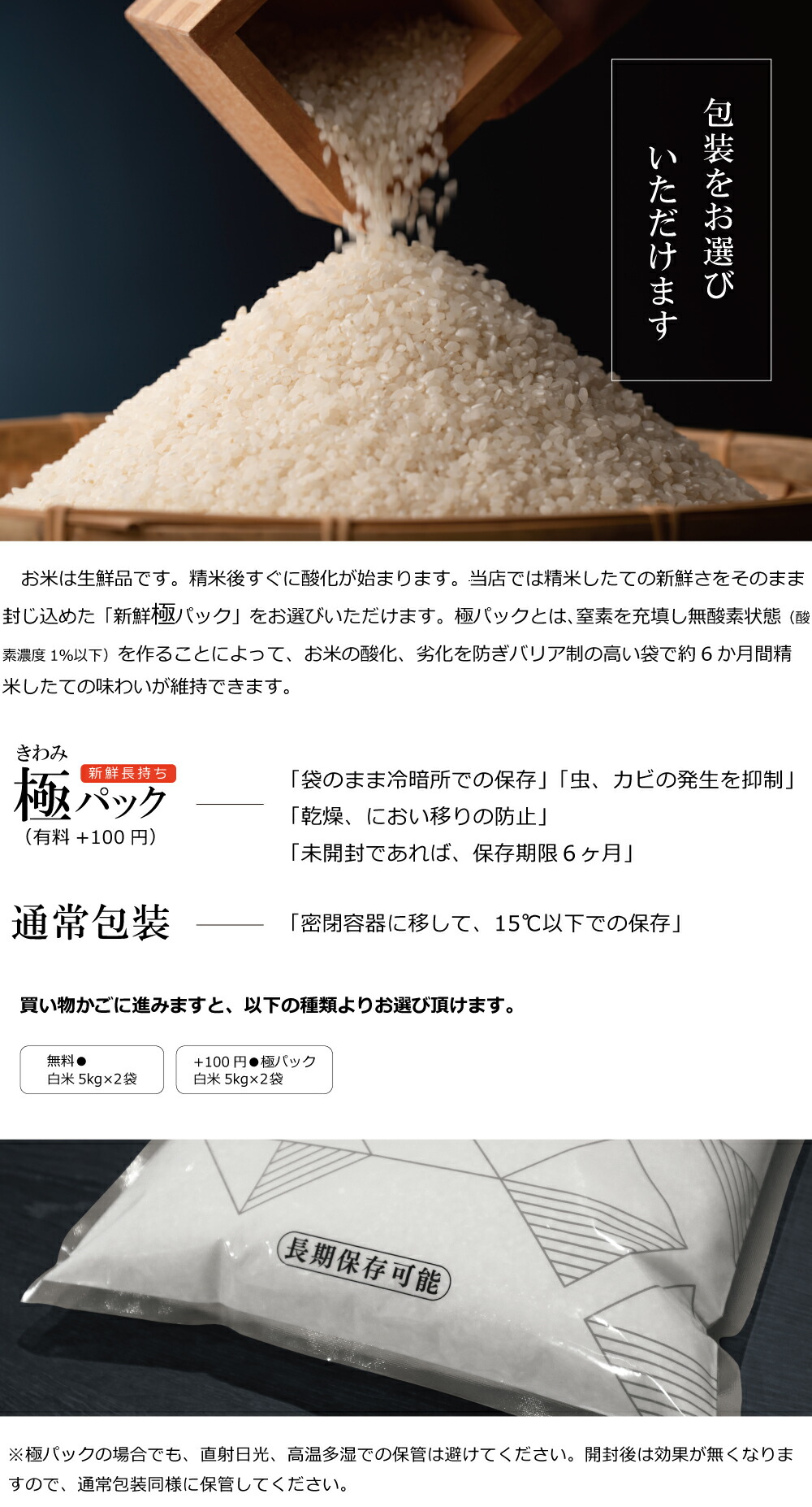 | 保存方法 | 【通常包装】 ●温度の高い場所を避け、密閉容器に移し15℃以下で保管して下さい。(袋のままの保存はNG) ●お米は湿気を吸い易く、カビ等の原因になりますので保管にご注意下さい。 ●保管容器は、虫の発生を防ぐためにも、こまめに清掃して下さい。 ●お米は臭いを吸着し易い食品です。臭いの強い食品や洗剤、灯油などのそばには置かないで下さい。 ●開封・未開封に関わらず品質保証は商品到着後7日以内となります。 保管方法の詳しくはこちら 【極パック包装】 ●冷暗所での保管。 ●未開封であれば約180日ほどフレッシュにいただけます。 | |||||